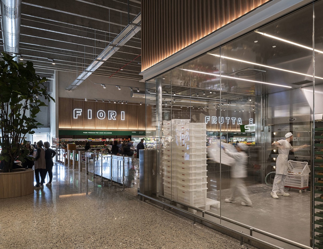 這是一個(gè)將近5000方的超市,是意大利老牌零食商 Esselunga 打造的新零售業(yè)態(tài)。新店超市設(shè)計(jì)打破了原有業(yè)態(tài)與商品品類(lèi),重塑了空間的布局,將咖啡吧、熟食和面包等的生產(chǎn)和加工區(qū)域放在前門(mén)較為明顯的區(qū)域,將收銀臺(tái)放到了門(mén)店的右側(cè),讓食品制作的過(guò)程一一呈現(xiàn)在消費(fèi)者眼前,制造美食社交的場(chǎng)所。這里,不僅僅是超市,而是一個(gè)社交、會(huì)議,用餐的生活方式空間,它重塑了傳統(tǒng)超市的布局,樹(shù)立了全球新標(biāo)桿。